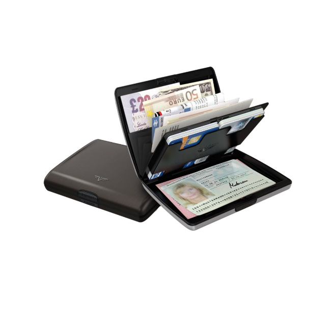 Being the first fully-fledged aluminium wallet worldwide with a patented two compartment system, PAPERS & CARDS allows to separate and securely store documents, business cards, ID-cards, driver’s license as well as a big amount of credit and loyalty or membership cards. With a height of only 23 mm TRU VIRTU RAY is the only two compartment aluminium wallet that may hold up to 16 credit cards as well as several bills and documents.