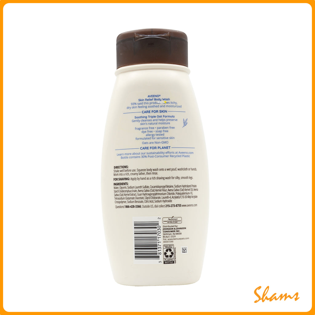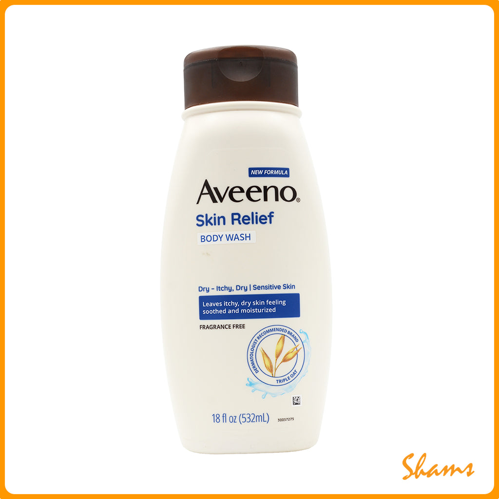Gently cleanse while leaving itchy, dry skin feeling soothed & moisturized with Aveeno Skin Relief Fragrance-Free Body Wash. This unscented body wash is made with a soothing Triple Oat® complex & is formulated for sensitive skin. Aveeno Skin Relief Body Wash gently cleanses & helps preserve skin's natural moisture barrier. 9 out of 10 agreed this product left itchy, dry skin feeling soothed and moisturized. From the dermatologist-recommended brand for over 70 years, this body wash for sensitive & dry skin is allergy-tested, free of fragrances, parabens, dyes, & soaps, & is suitable for daily use. To use, squeeze body wash onto a wet pouf, washcloth, or hands. Work into a rich, creamy lather, then rinse.