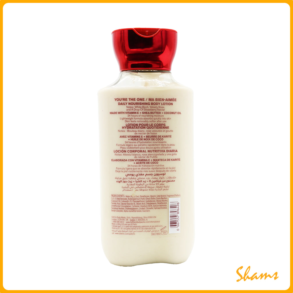 BBW You Are The One Body Lotion 236ml is a luxurious moisturizing formula designed to nourish and hydrate your skin with a delightful fragrance. This 236ml bottle provides long-lasting softness and smoothness, leaving your skin feeling silky and refreshed throughout the day. Perfect for daily use, this body lotion combines effective hydration with an enchanting scent that keeps you feeling confident and pampered.