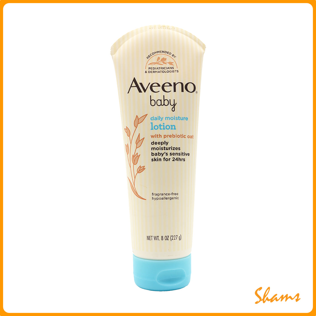 Deeply moisturize your little one's delicate skin for a full 24 hours with Aveeno Baby Daily Moisture Body Lotion with nourishing prebiotic oatmeal. This nourishing baby body lotion is specially formulated to be gentle enough for baby's delicate and sensitive skin. Formulated with oatmeal, this lotion moisturizes sensitive skin for a full 24 hours. The fast-absorbing, non-greasy formula helps deeply moisturize baby’s delicate skin. This hypoallergenic baby lotion can be used every day to keep your baby's skin soft, smooth, and healthy-looking.