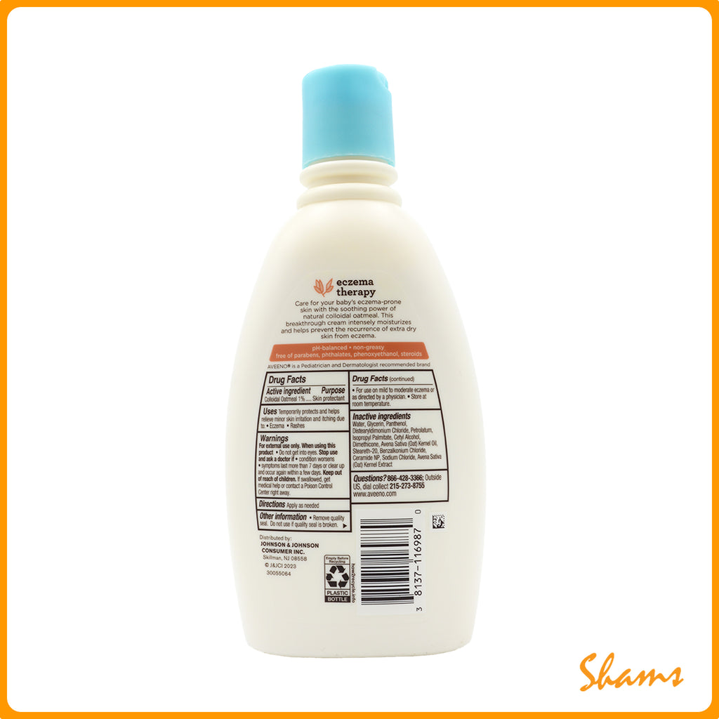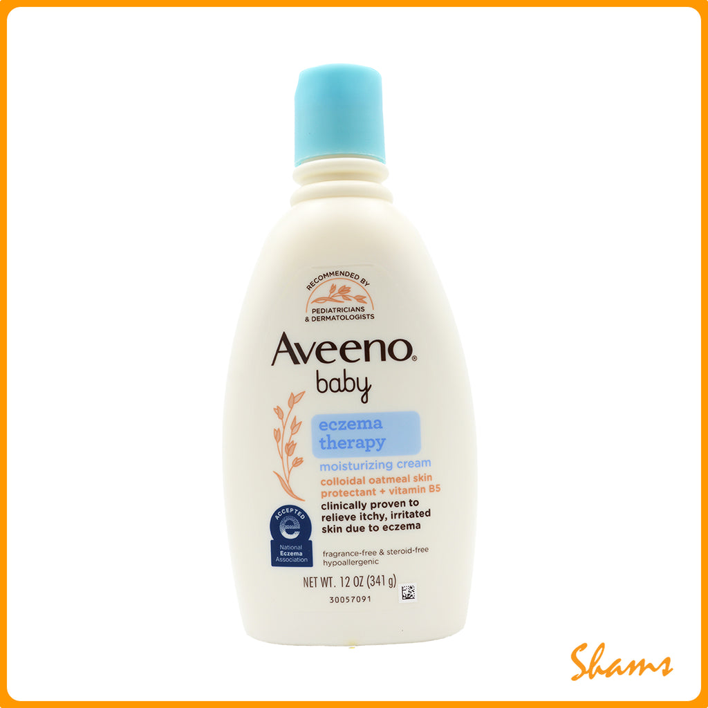 Aveeno Baby Eczema Therapy Moisturizing Cream helps relieve dry, itchy, irritated skin due to eczema. Developed with leading dermatologists, this hypoallergenic baby eczema cream uses the soothing power of natural colloidal oatmeal to help strengthen the skin's moisture barrier for prevention and protection against dryness. Formulated specially for babies, this non-greasy baby cream is clinically proven to relieve itchy, irritated skin due to eczema and intensely moisturizes skin to prevent the recurrence of extra dry skin from eczema. The unique formula, made with Natural Colloidal Oatmeal skin protectant and vitamin B5, is pH-balanced and free from steroids, fragrances, parabens, phthalates and phenoxyethanol.