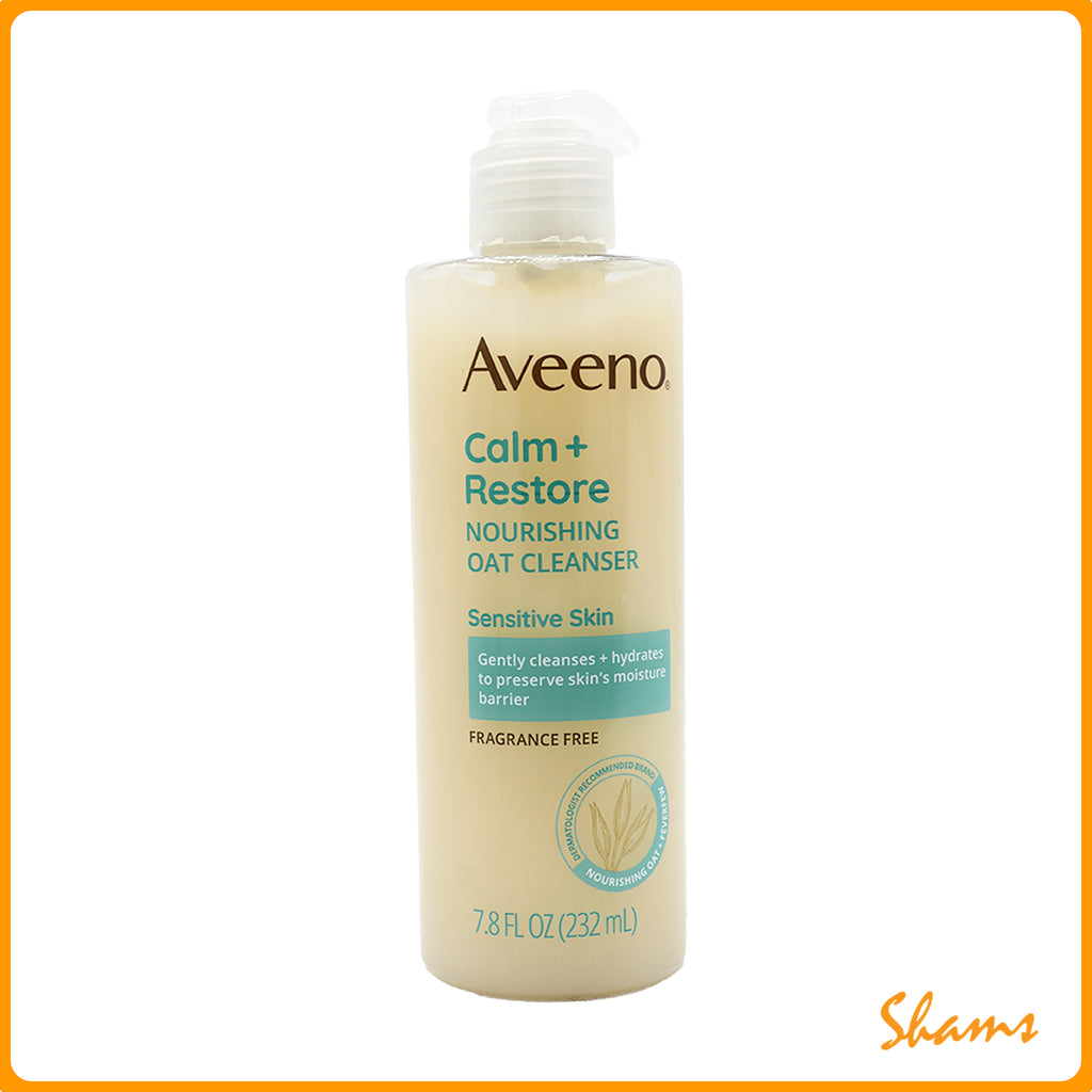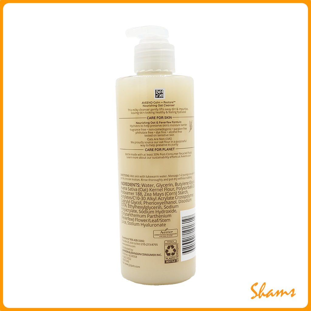 Aveeno Calm + Restore Daily Hydrating Facial Cleanser for Sensitive Skin with nourishing oat and calming feverfew that gently cleanses and hydrates skin. The daily facial cleanser is ideal for dry skin and this gentle milky cleanser lifts away dirt and impurities, while leaving the skin looking healthy and feeling smooth. Aveeno Calm + Restore Nourishing Oat Cleanser is suitable for sensitive skin and helps preserves the skin's moisture barrier. The non-comedogenic and hypoallergenic formula of this gentle face cleanser for dry skin has been tested on sensitive skin and is free from fragrances, parabens, alcohol, dyes, and phthalates