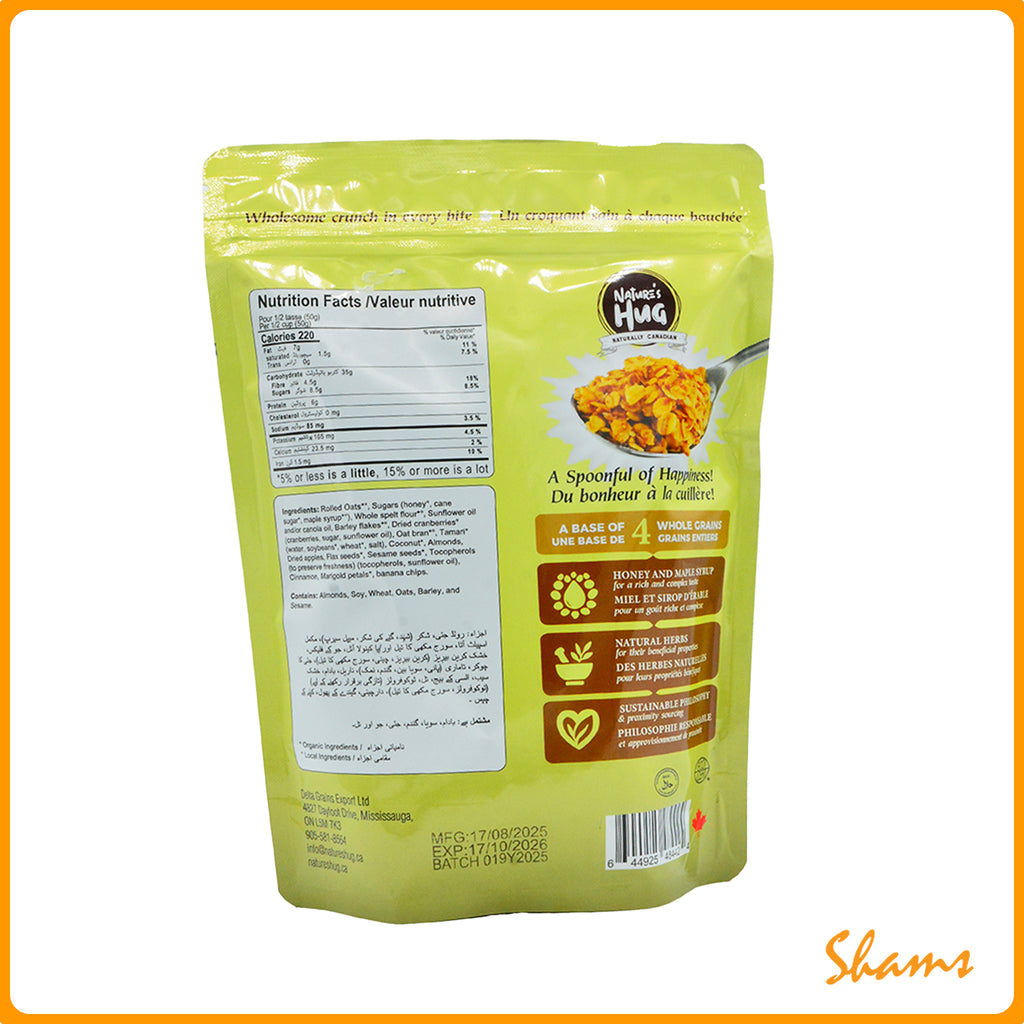 Nature’s Hug Honey Almond Granola features toasted organic oats, crunchy almonds, and a touch of honey for a light, naturally sweet flavor. Rich in fiber, plant-based protein, and healthy fats, it's crafted without artificial additives or preservatives. Packaged in a resealable 330g pouch, it’s ideal for maintaining freshness. Perfect for enjoying with milk, yogurt, or as a satisfying snack straight from the pouch.