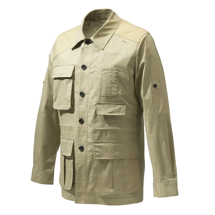 Hybrid Jungle men's jacket designed for hunting and outdoor activities in the hot season where breathability and lightness are essential. Made of light stretch cotton with protective inserts, with anti-insect treatment.