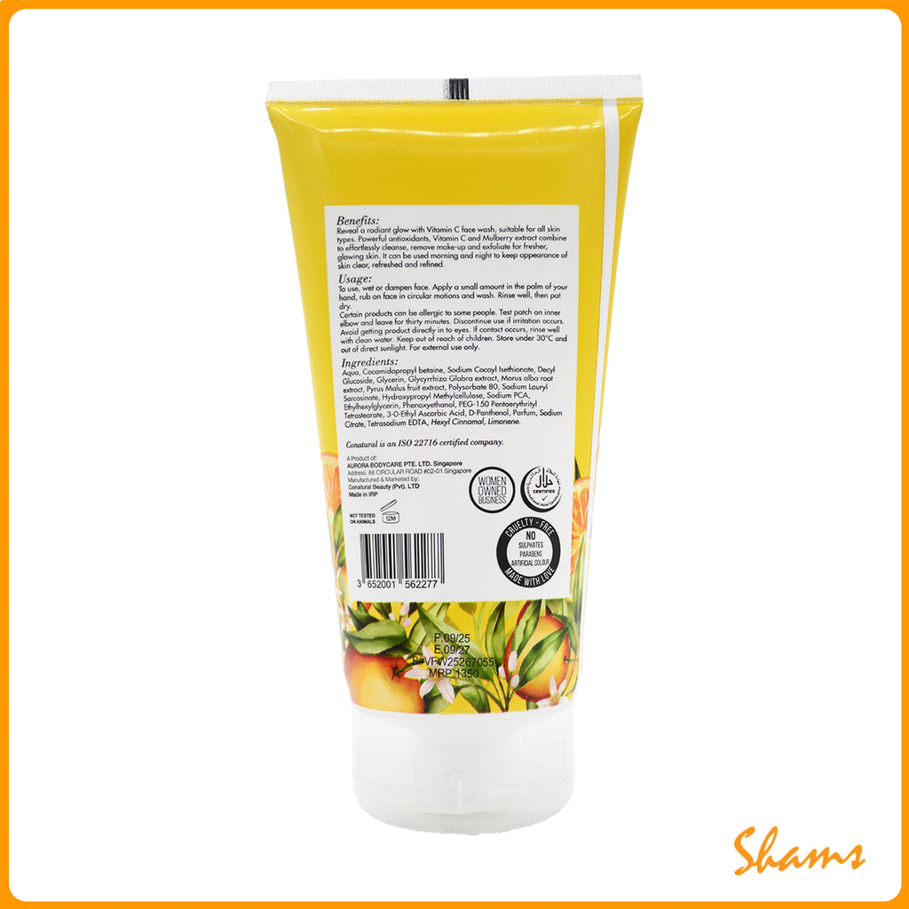 - Vitamin C: This face wash is enriched with a stable form of Vitamin C – 3-o-Ethyl-L-ascorbic acid - which is a powerful antioxidant that neutralizes free radicals and shields your skin from environmental damage and premature aging. It works to brighten your complexion by inhibiting melanin production, reducing hyperpigmentation, and fading dark spots, while also promoting an even skin tone. Additionally, Vitamin C stimulates collagen synthesis, enhancing skin firmness and reducing the appearance of fine lines and wrinkles. With regular use, this face wash reveals firmer, more youthful, and radiant skin.