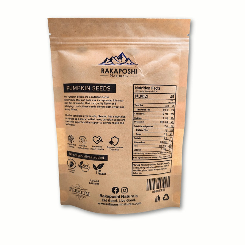 Small in size, mighty in nutrients—Rakaposhi Naturals’ Pumpkin Seeds are your go-to source of plant-powered protein, zinc, and magnesium. Harvested with care and left completely natural, these crunchy green gems support heart health, immunity, and better sleep.