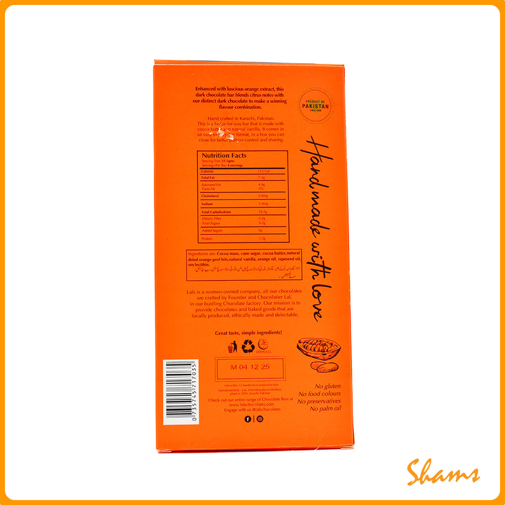 Lals Chocolate 56% Cocoa Orange Dark combines bold dark chocolate with bright citrus notes in a sophisticated 90g bar that excites the palate. This premium blend features a higher cocoa content that delivers deep, complex flavors beautifully complemented by refreshing orange essence. Perfect for those seeking an elevated chocolate experience, this artisanal creation offers a delightful balance of richness and zesty brightness.