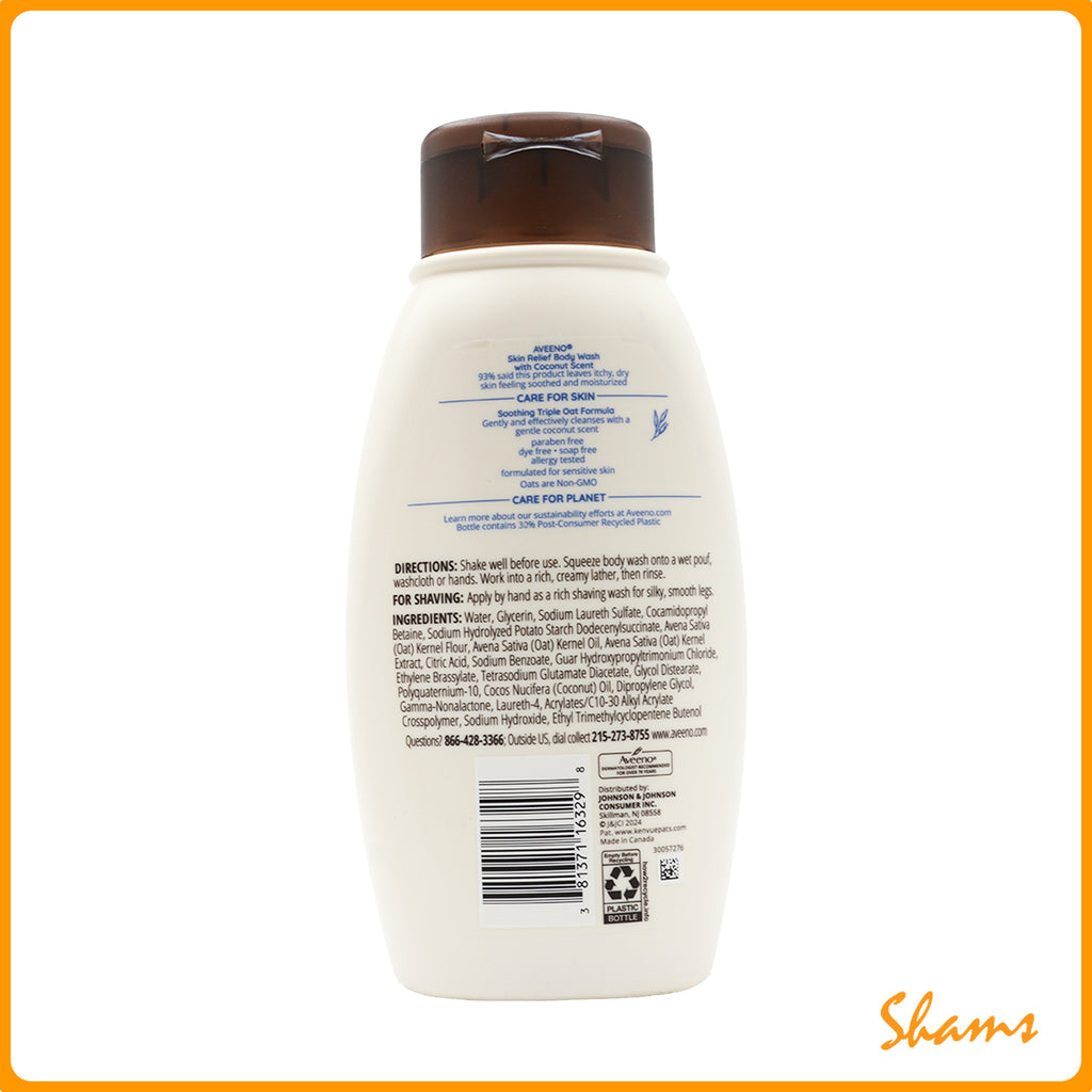 Gently cleanse your itchy, dry skin with Aveeno Skin Relief Body Wash with Coconut Scent. This daily body wash is designed to gently remove dirt and impurities without disrupting skin's natural moisture barrier, for skin that is left feeling soft, smooth and healthy-looking. Its unique formula is enriched with soothing oat to help leaves skin feeling moisturized and features a tropical coconut scent. The dry skin body wash is allergy-tested and suitable for sensitive skin.