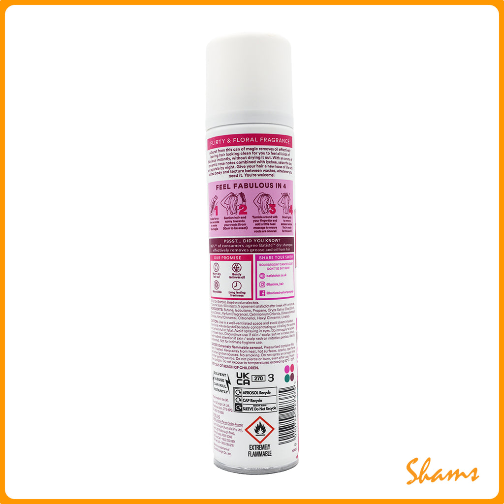 Batiste Blush Dry Shampoo refreshes hair between washes with its flirty floral fragrance. This 200ml formula instantly absorbs excess oil, eliminates odor, and adds texture and body to limp hair. Perfect for on-the-go styling, travel, or extending the life of your blowout without water. Simply spray, massage, and brush for revitalized hair in seconds.