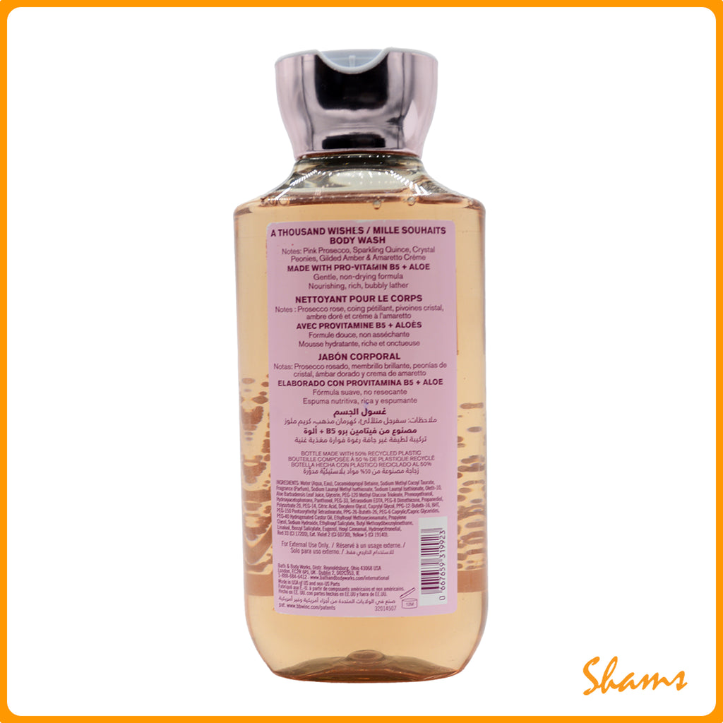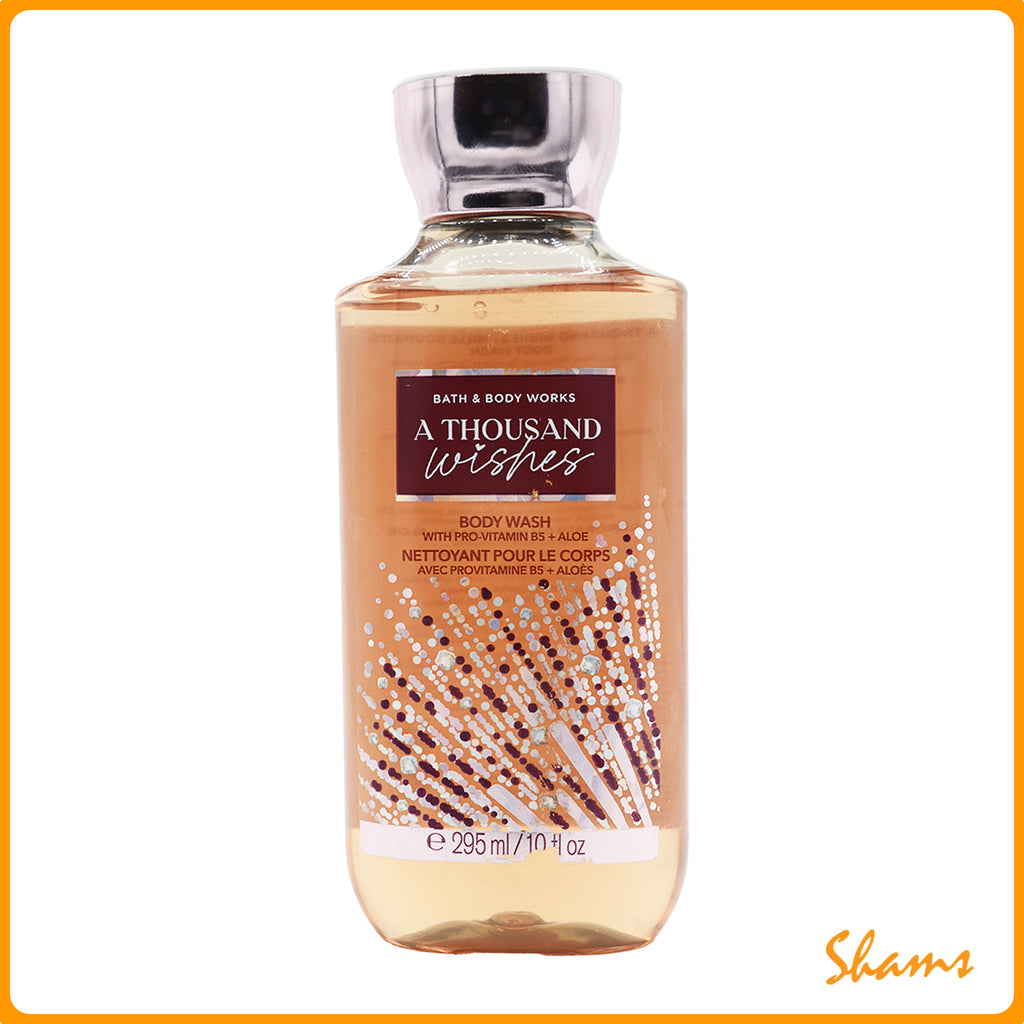 A Thousand Wishes Body Wash by Bath & Body Works delivers a luxurious cleansing experience with its rich, creamy formula that gently removes dirt and impurities while leaving skin soft and moisturized. Infused with a delightful blend of sparkling citrus, vanilla, and almond notes, this 295ml bottle transforms your daily shower into a sensory escape. Perfect for daily use, this body wash rinses clean without leaving residue, making it an essential addition to your skincare routine.