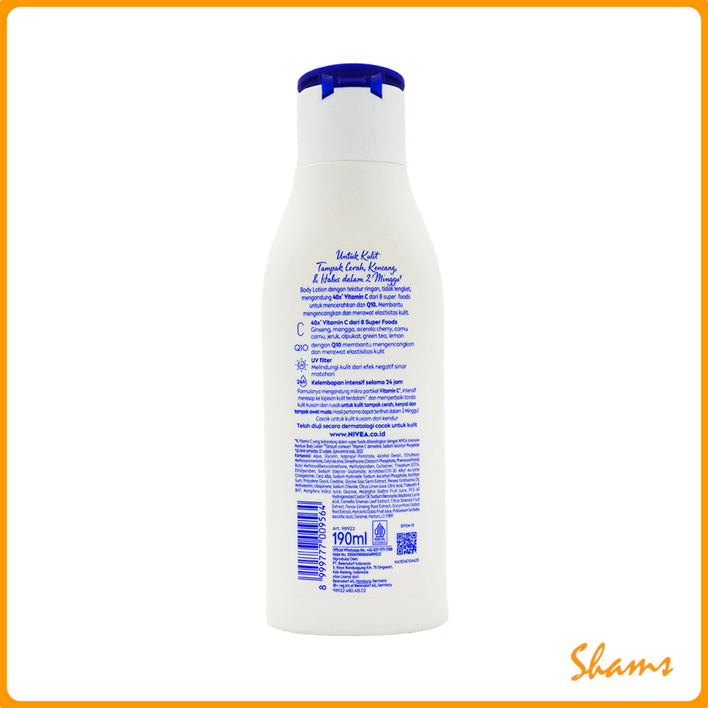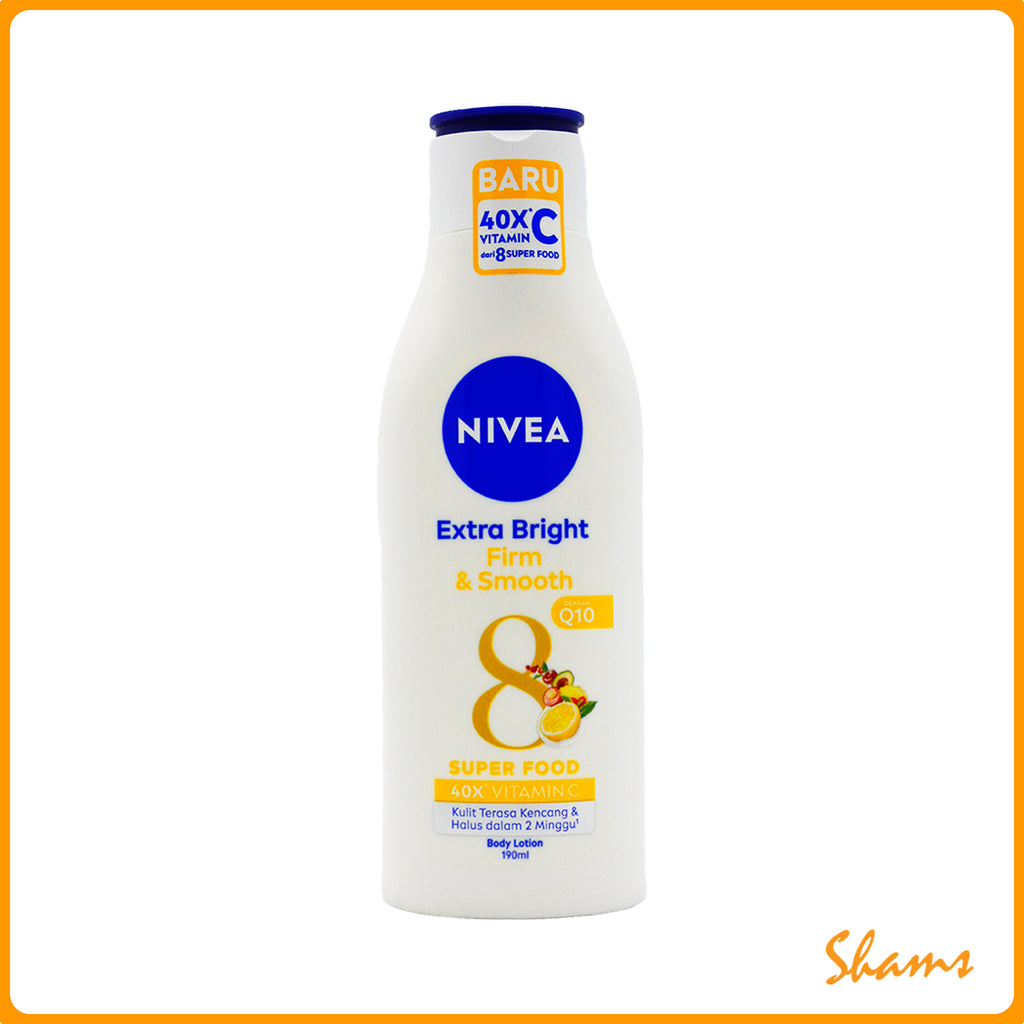 Nivea Extra Bright Firm & Smooth Body Lotion delivers intensive hydration while visibly firming and smoothing your skin with every application. Enriched with brightening ingredients, this 190ml lotion helps reduce the appearance of dullness and uneven tone for a radiant complexion. Perfect for daily use, it absorbs quickly without leaving greasy residue, leaving your skin soft, supple, and luminous.