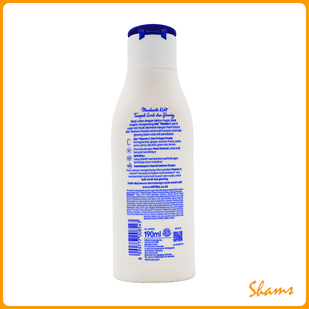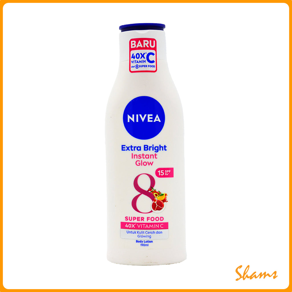 Nivea Extra Bright Instant Glow Body Lotion delivers radiant, luminous skin with its advanced brightening formula enriched with vitamin C and niacinamide. This lightweight 190ml lotion absorbs quickly, providing deep hydration while visibly reducing dark spots and uneven skin tone for a glowing complexion. Perfect for daily use, it leaves your skin soft, smooth, and noticeably brighter with a natural, healthy radiance.