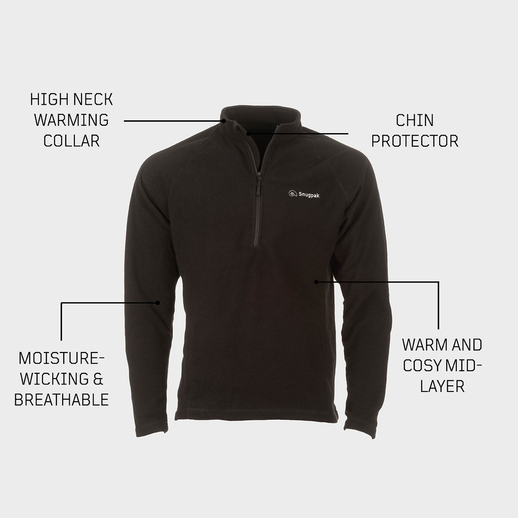 The black fleece shirt features a soft, brushed inner surface that feels gentle against the skin, while the outer surface has a smooth finish that resists pilling and wear. The shirt is designed with a half-zip front for easy ventilation and temperature control, as well as a high collar to protect the neck from cold winds. Elasticated cuffs and hem help to seal in warmth and provide a snug fit.