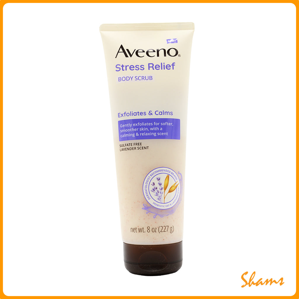 - Aveeno Stress Relief Exfoliating Body Scrub for women and men, gently exfoliates to reveal softer, smoother skin in just one week while the lavender scent leaves you feeling calm and relaxed in the shower