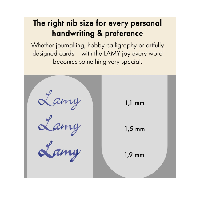 Discover the LAMY joy: it is the perfect writing instrument for anyone who wants to express their creativity and personality. The pen is equipped with a ribbon nib that makes creative lettering and more demanding calligraphy work easy - and the nib tip also adds a very special touch to any handwriting in everyday life. The overall appearance and the ergonomic grip are based on the design of the cult fountain pen LAMY safari, while the tapered body epitomises a homage to traditional nib pens. Whether journalling, hobby calligraphy or artfully designed cards – with the LAMY joy every word becomes something very special.