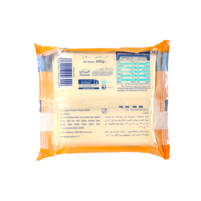 Almarai Cheddar Cheese Slices deliver authentic, creamy flavor in convenient individual portions. Each slice melts smoothly over burgers, sandwiches, and grilled dishes, bringing rich cheddar taste to your meals. Made with quality ingredients, these slices are perfect for quick lunches, snacks, or family dinners. The 200g pack keeps your cheese fresh and ready whenever you need it. Enjoy the classic taste of cheddar in every bite.