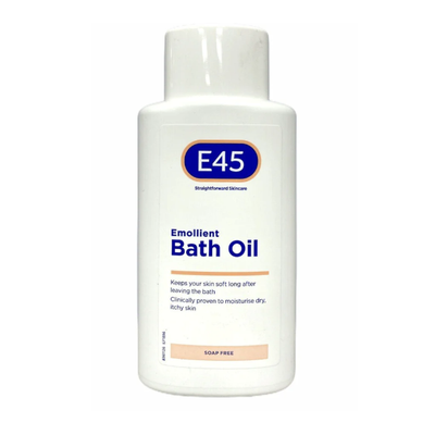 E45 Emollient Bath Oil is a dermatologist-tested, gentle formula that soothes and moisturises dry, itchy, and eczema-prone skin. With only three ingredients and no added soap, dyes, or perfume, it locks in moisture, prevents dryness, and keeps skin soft. Suitable for the whole family, including babies over one month old.